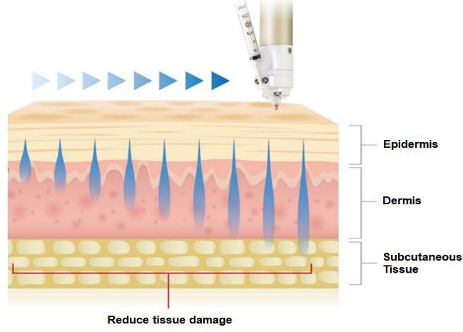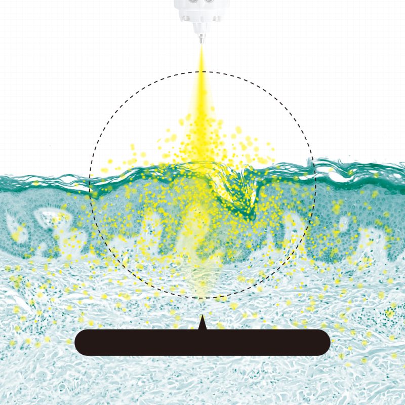 キュアジェットは高圧ジェットの力で、皮膚の比較的浅い層に均一に、そして確実に薬剤を届けることができる新しい機序の治療機器です。従来のダーマペンやポテンツァなどとは異なり針を用いないため、比較的痛みが少なく、内出血などのダウンタイムも少なめな治療と言われていますが、目的や期待する効果に応じてジェットの強さを使い分けることにより痛みやダウンタイムを調節します。また、高圧のジェットにより皮下の組織を物理的に切断することができ、いわゆるマイクロサブシジョンを行うことができることからニキビ痕や毛穴、瘢痕などの傷跡、しわなどに対する効果も高いと考えられています。ジェットの刺激により皮膚の再生が促されることから、コラーゲンやエラスチンの増生が生じ、小じわや肌質改善などといったリジュビネーション効果もかなり期待できます。使用する薬剤により様々な異なる効果を発揮できる点もキュアジェットの利点になります。
